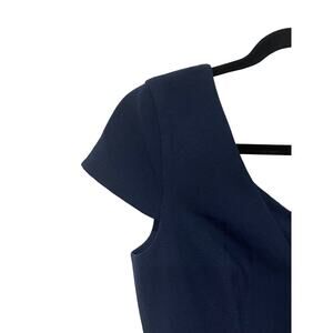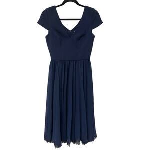 color: midnight blue, crepe dress, chiffon skirt, hidden back zip closure, v neck, cap sleeves, lined