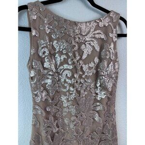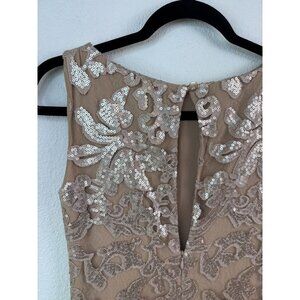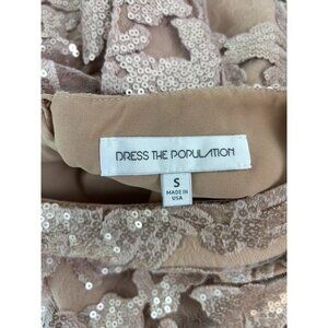 Dress the Population brand women's size small beige fitted mini dress. In excellent condition, little to no sign of wear. Beige lined with an attached lace overlay dress. Dress has an allover sequin pattern, shimmers in the light beautifully. High neckline, sleeveless, with a keyhole button closure in back. Back also has a hidden zipper closure.