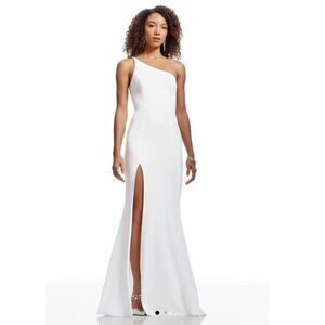 Store display model! Currently $228 in stores. The Amy is a body-hugging floor-length gown made of classic crepe. This elegant gown features an asymmetrical neckline that highlights the shoulders and decolletage. The long trumpet skirt and fitted bodice, which hugs the bust, waist, and hips, helps to create a gorgeous hourglass shape. This gown is flattering and versatile for any formal event.