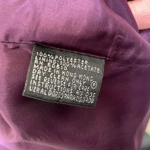 Sleek plum sleeveless sheath with matching jacket. Both pieces fully lined. Jacket has goring detail for a tailored, trim look. Sheath has back zip, kick vent, and a pocket on the right. Jacket has hook and eye closures and a pocket on the right also. Fabric has an all over sheen to it.