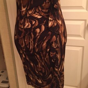 Perfect brown, tan and beige color for fall! Figure hugging ruched design. Attractive asymmetrical neckline with cascading swirls of fabric in front.
