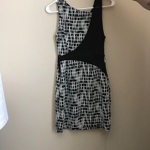 Black and white patterned dress with mesh cut outs, size small. NWT.