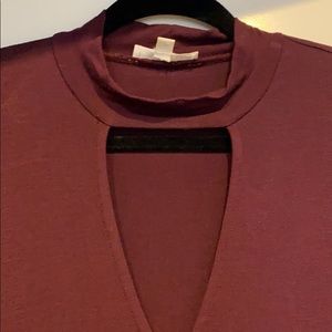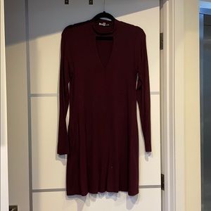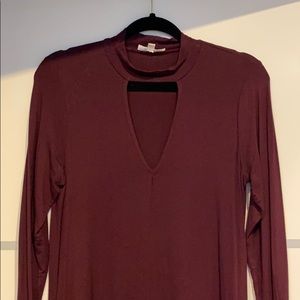 Maroon long sleeve dress with mock turtle neck and key hole cut out, dress is very soft material and has pockets