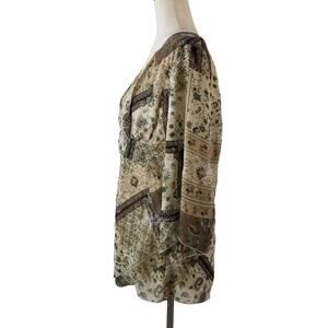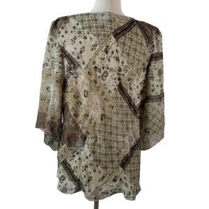 DressBarn Brown Cream Green Floral V Neck Boho Sheer Overlay 3/4 Sleeve Top XL