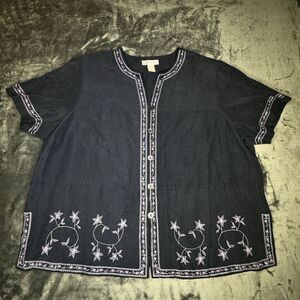DressBarn Sz 24W SILK LINEN Blend Embroidered Short Sleeve Blouse Top Charcoal