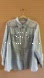 DressBarn Women’s lightweight denim button down blouse with small white polka dots throughout