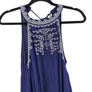 Dress Boho Halter Tie Back Swing Shift Sleeveless Knee Embroidered Navy Sz S