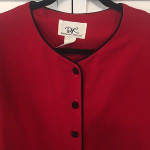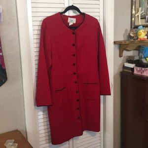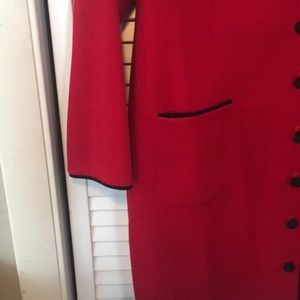 Red button down jacket dress, duster. black trim and velvet, buttons. Pair with camo, slacks or skirt, and heels for a great holiday outfit! Office to dinner to not gut on the town!