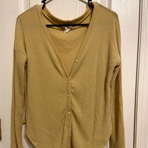 Pale yellow, lightweight sweater, ribbed fabric. Would suggest wearing over something because the buttons do not always stay buttoned.