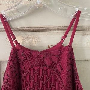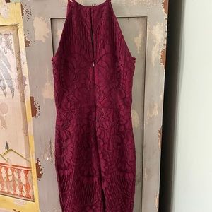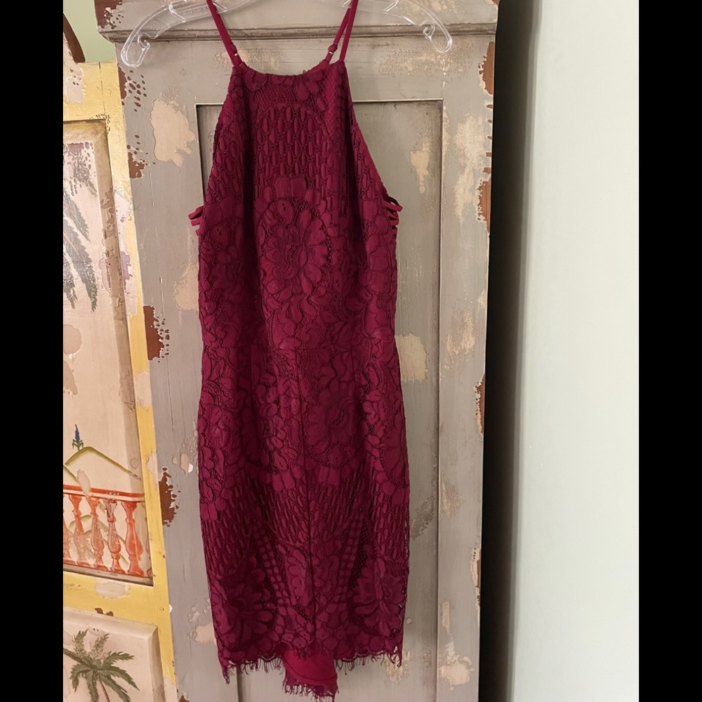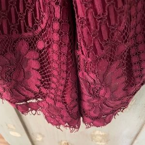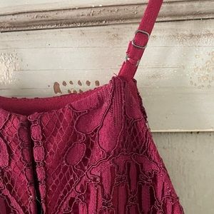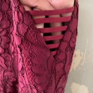 Burgundy lace front n back peep n back with one button closure n back zip closure has a slight dip n back very pretty excellent condition
