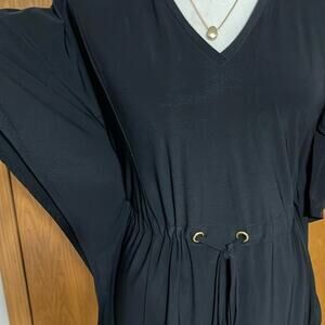 A perfect summer little black dress. Lightweight, sleeve coverage (if you like that), and sooo figure flattering. Batwing style and faux slits on side, with drawstring waist. Super stretch, pull on.