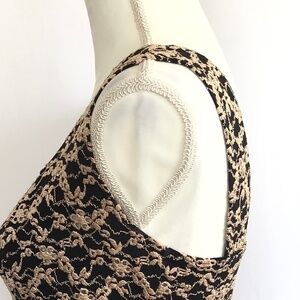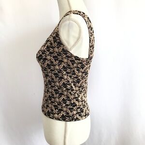 Dressbarn black & tan sleeveless flower pattern blouse top. It has a square shape in front and back. Cute as ever! Great with a pair of shorts or jeans! Gently used...size medium...no flaws noted...see photos for care details.