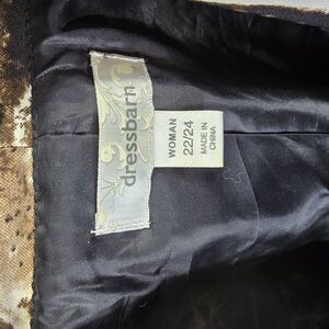 This stylish cape from Dressbarn features a striking abstract pattern in black and brown, offering a chic and modern look. The open-front design and three-quarter length sleeves provide a sophisticated touch, making it an ideal layering piece. With its luxurious fabric, this cape is perfect for elevating any ensemble.