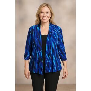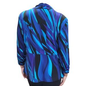 Bold, flowing cardigan by Dressbarn featuring vibrant geometric waves in striking shades of blue. Draped, open-front cut makes it perfect for layering with workwear, evening outfits, or as an art-to-wear statement piece. The lined polyester/spandex blend adds comfort and stretch for easy movement. Made in the USA of imported fabrics.