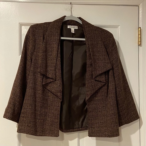 Elevate your wardrobe with this Dressbarn blazer in a classic brown tweed. Perfect for adding a touch of sophistication to your professional or casual outfits.