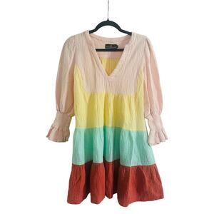 Pre-owned. Excellent condition. Gorgeous beading along front neckline. Tiered asymmetric ruffle detail at skirt. Sleeveless. Back zip.