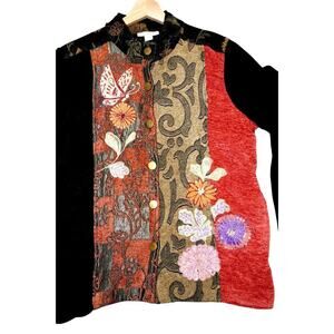Eye-catching bohemian-style jacket by Dressbarn featuring a mixed tapestry patchwork design with floral and butterfly embroidery. Earthy color palette with red, gold, black, and olive tones. Textured knit sleeves, side pockets, and antique gold-tone button front. A true artsy statement piece perfect for layering in fall and winter.