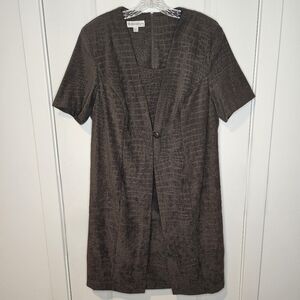Item: Vintage Dressbarn short sleeve dark green textured dress with Crocodile/Alligator embossed look, animal print, single button closure, one-piece sheath dress, knee length