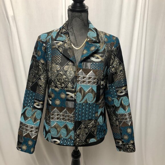 This Dressbarn jacket features a unique elegant patchwork tapestry design with a blend of geometric and abstract patterns.