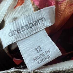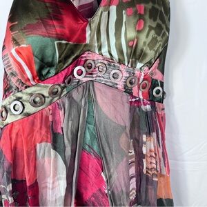 Stylish Dressbarn Size 12 flowy gauzy lightweight backless halter dress with vibrant multicolor design. Built in bra padding for flattering fit. Mother of Pearl Round style Buttons adorning waist line