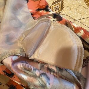 Women's blazer by dressbarn, featuring a colorful abstract print in shades of coral, brown, and beige. The blazer has an open front, 3/4 sleeves with rolled cuffs, and a light colored lining. It is made from materials like polyester or a blend with spandex, providing a comfortable and lightweight fit. They are suitable for various occasions, ranging from casual outings to more dressy occasions. This blazer is a versatile addition to your wardrobe. Good condition. See measurements for proper fitting for you. Thanks for looking!