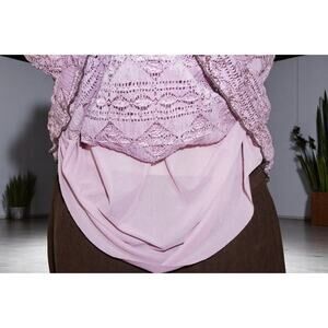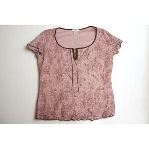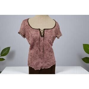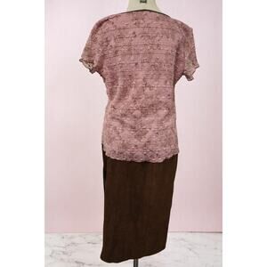 Step into soft, romantic Y2K vibes with this Dressbarn two-piece set. Featuring a dusty pink sheer lace peasant blouse with flutter sleeves and lace-up neckline, paired with a solid brown midi-length skirt. The top has a stretchy lining and textured lace overlay, while the skirt has a soft suede-like texture and a flattering silhouette. A perfect feminine outfit for brunch, casual days, or cottagecore-inspired styling.