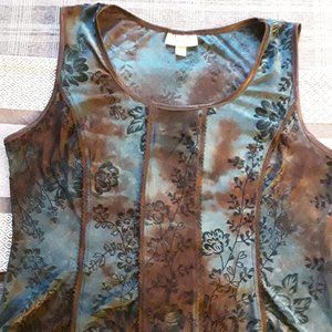 Utterly feminine, this princess cut blouse features a velvety raised floral design on a turquoise & brown double knit fabric. The princess lines are highlighted with brown lace which add to the overall slimming effect. It is sleeveless with a scooped neck. This top is lightweight, stretchy & very comfortable. Lovingly worn, it is still in good condition with no stains, rips or tears. Measurements when flat: Bust: 21"; Hips: 22"; Length from under arm: 14-1/4"