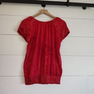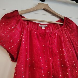 Women's Dress Barn Red Sparkly Elastic Waist Short Sleeve Blouse Size Large