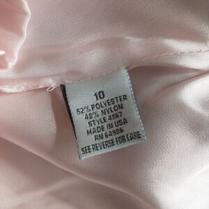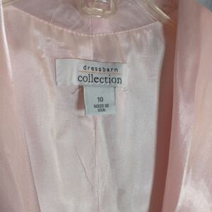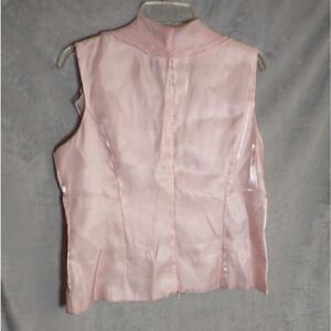 Dressbarn Sleeveless Top. Pink with a shimmery sheen. Has a faux buckle on the front with cubic zirconia. V-neck with a zipper up the back. The zipper goes from the bottom up about two thirds of the top. Size 10. Polyester and Nylon Blend. No rips, tears or stains. Has slight smell from being in a closet long term. Smoke free/Dog friendly home.