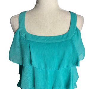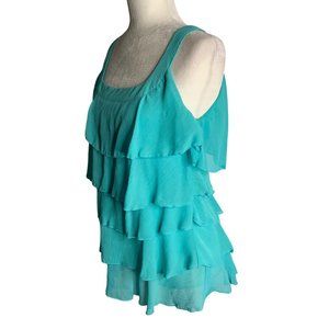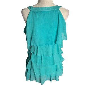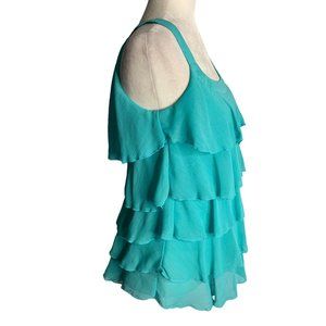 Dressbarn Tiered Ruffle Sleeveless Blouse Top S Teal Blue Chiffon Scoop Neck