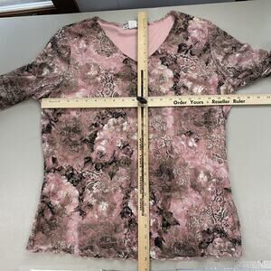 Dressbarn Top Womens 1X Pink Brown Metallic Floral Lace Bell Sleeve Blouse Layered