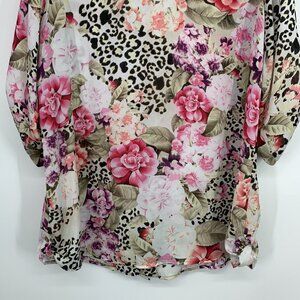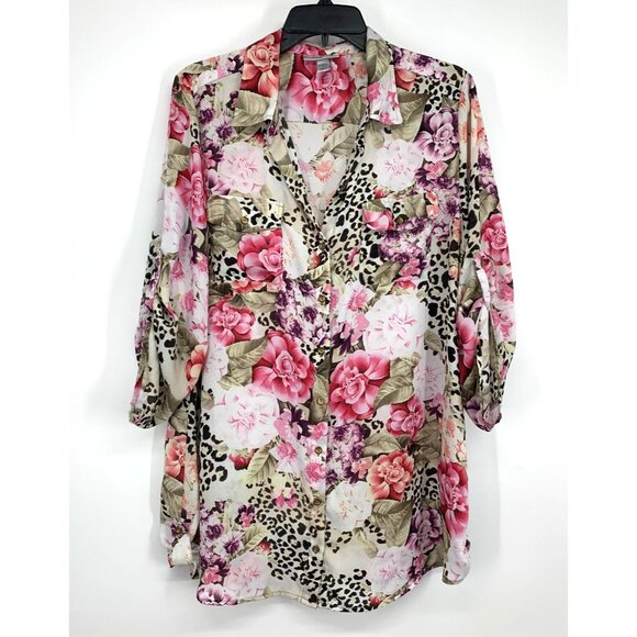 Dressbarn Top Womens Plus 1X Floral Print Button Down V Neck Roll Tab Sleeve Boho Romantic Lightweight. Great pre-owned condition.