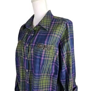 Elevate your casual look with this stylish button-up shirt top from Dressbarn. Crafted from a cotton blend fabric with a green and pink plaid pattern, this classic shirt features a collared neckline and button-down closure. The long sleeves with casual sleeve type and the beaded accents on it add a touch of elegance to the top.