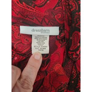 Ignite your wardrobe with this captivating Dressbarn blouse, a symphony of elegance and intrigue. A mesmerizing red and black paisley pattern dances across the sheer fabric, creating a look that's both bold and ethereal. The unique frog closures add a touch of vintage charm, securing the front with an artful knot. The flowing silhouette drapes beautifully, offering a comfortable and flattering fit. This blouse is perfect for adding a touch of bohemian flair to a casual brunch, elevating your evening attire for a dinner date, or making a statement at a special event.