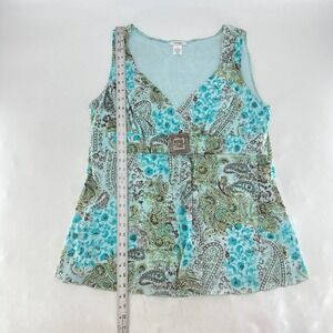 A turquoise paisley print sleeveless tunic top by Dressbarn Woman. This v-neck top features a decorative embellished square buckle at the empire waist and a flowing silhouette. The sheer outer layer is lined for comfortable wear. Perfect for a casual day out or a relaxed evening.
