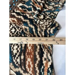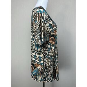 This Dressbarn women's blouse features a beaded neckline and a handkerchief hemline with turquoise accents. The blouse has a V-neckline, 3/4 sleeves, and a pullover closure. It is made of polyester/spandex and rayon fabric, which makes it lightweight and stretchy. The blouse is designed for women in size 18/20 and has a relaxed fit. It is suitable for various occasions such as travel, party/cocktail, casual, workwear, and business. The garment care instructions recommend hand wash only. The blouse is multi-colored and has a hippie, colorful, bohemian, peasant, classic, and designer theme.