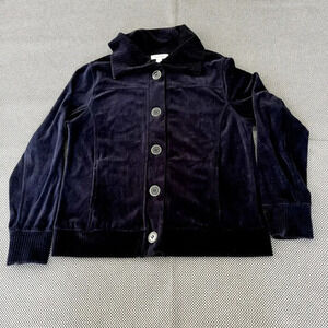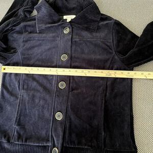 Dressbarn Womens Velour Short Coat Jacket Size L Navy Blue Button Up Pockets