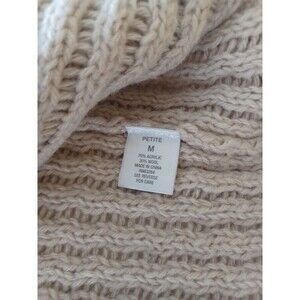 The Dressbarn chunky knit woolblend cardigan sweater in a petite size M is a stylish and cozy option for women looking for a boho retro look. Made from a blend of wool and acrylic, this solid beige sweater features a collared neckline, short sleeves, and a single big button for an accent. The chunky-knit fabric adds texture and warmth, while the inclusion of pockets adds both functionality and style. Perfect for layering, this versatile cardigan is machine washable for easy care and maintenance.