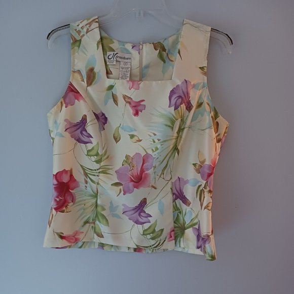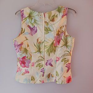 Beautiful sleeveless top and matching pants with a pastel floral/hibiscus print. Both top and bottoms are size 10 and feature a zipper close.
