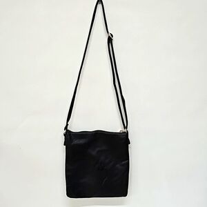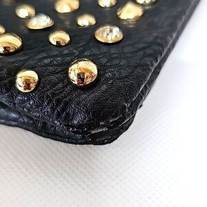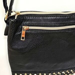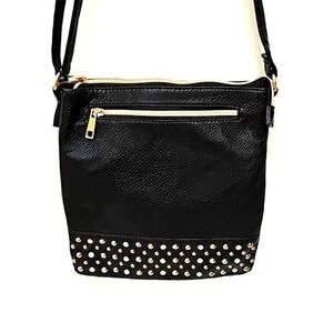Cute crossbody in black with gold studs, rhinestones and gold zippers. Has 3 main interior compartments that zip closed with the same zipper plus 1 interior small pocket with zipper, and 2 cell phone style pockets. 1 exterior zipper pocket.