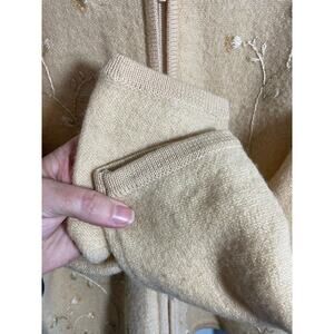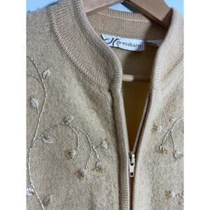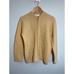 Dressbarn women’s small wool cream tan full zip sweater beaded floral motiff