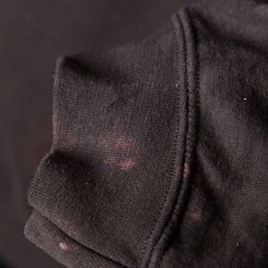 Has some bleach stains throughout and there is some slight cracking on the puff print.