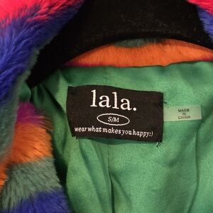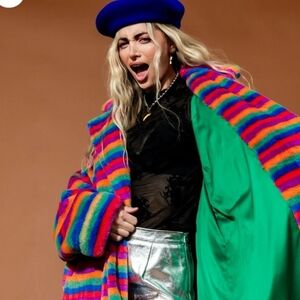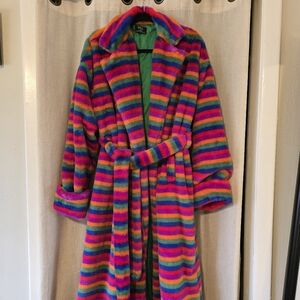 Rainbow Runaway Faux Fur Longline Coat - Dressed in Lala. NWOT. never worn. sooo cozy! ties across the middle and falls around the ankles. green satin lining.