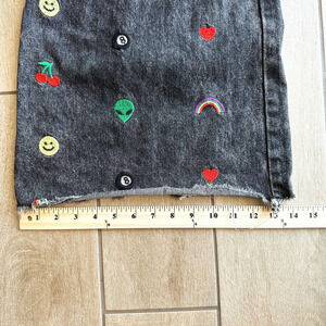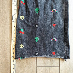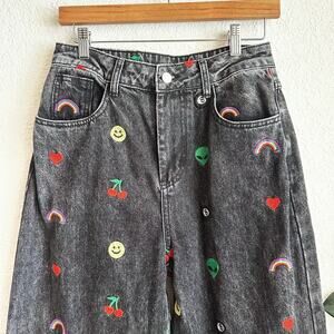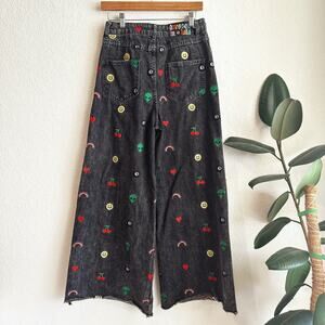 Stylish wide leg jeans. Black denim with vibrant embroidery. Features hearts, rainbows, cherries, and smiley faces.