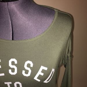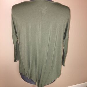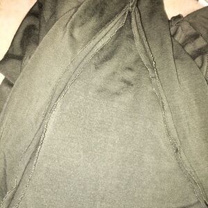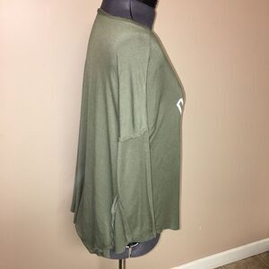 More of a 3/4 sleeve. Rough edging is intended but I took close up shots so you could see that it is throughout the shirt including on the seaming on the sides. Used but in good condition.