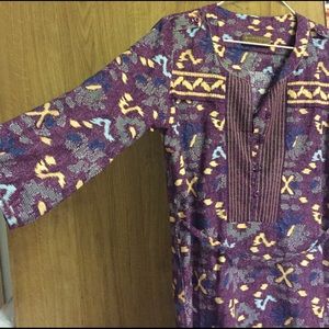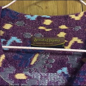 100% cotton with motif batik. Has a belt,front button