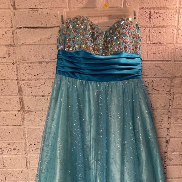 Dresses by Deb Blue Embellished Strapless Princess Prom Dress 7/8