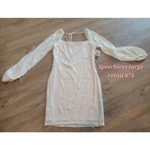 New tags, speechless sparkling white dress with dangling gems. Size large, see photos. Pet friendly home and non-smoking home.