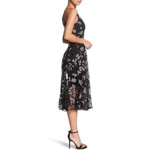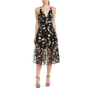 Dress the Population Audrey Plunge Neck Lace Overlay Midi Dress, Size Medium