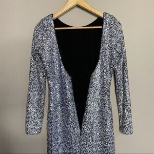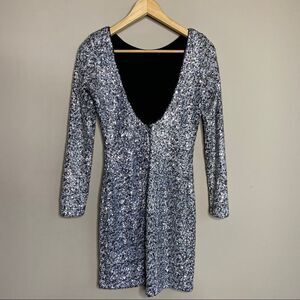 Sparkly Silver Sequined Low V-Back Bodycon Stretch Long Sleeve Cocktail Mini Dress | Dress The Population Lola